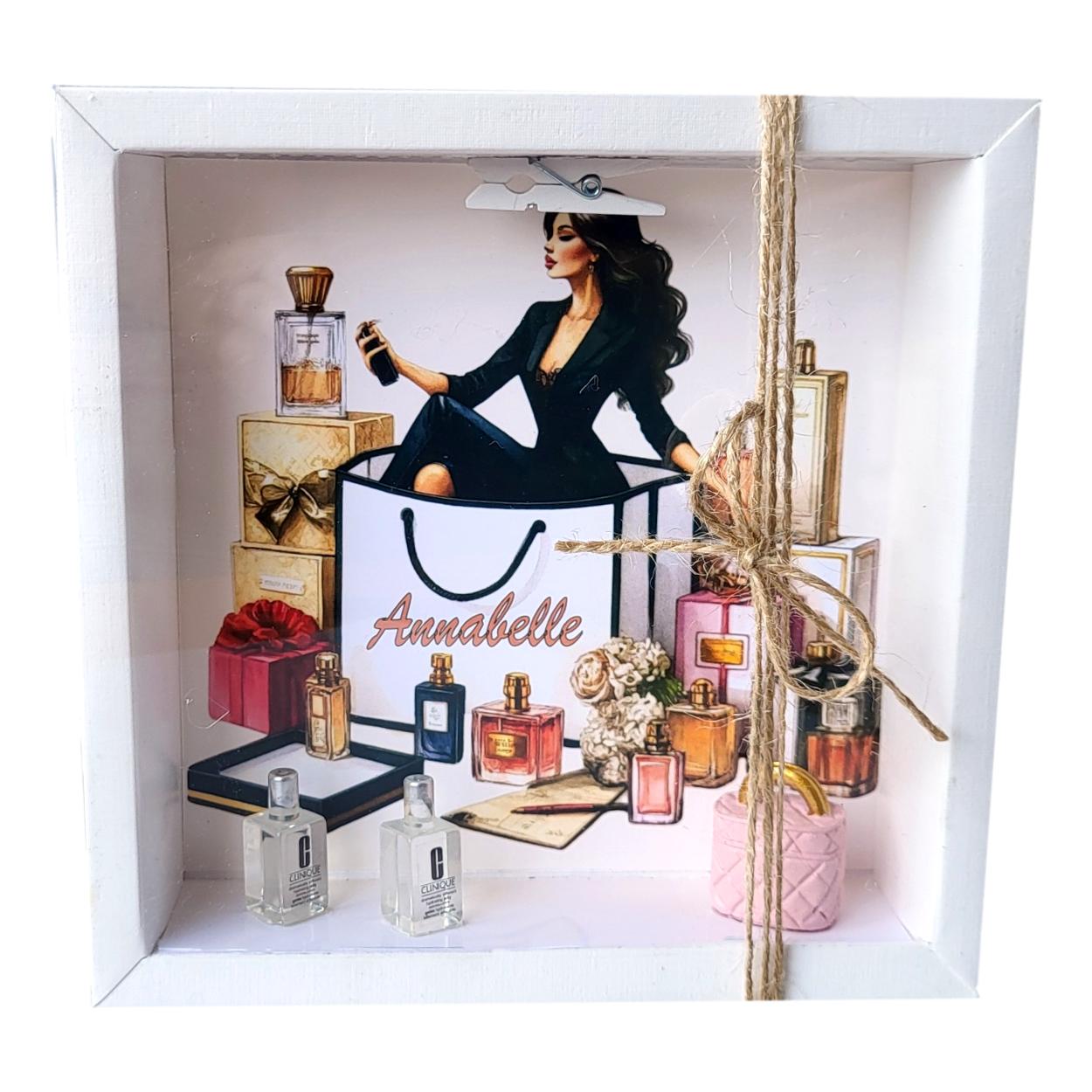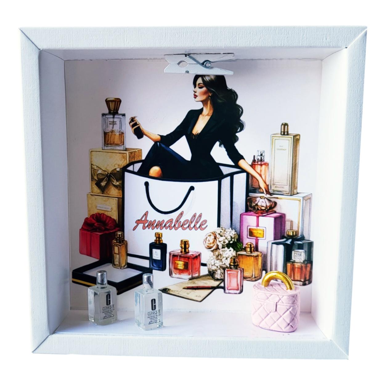 dekoriert mit Hintergrundbild "Fashionista" und kleinen Miniatur Parfümflaschenattrappen und kleiner Bag