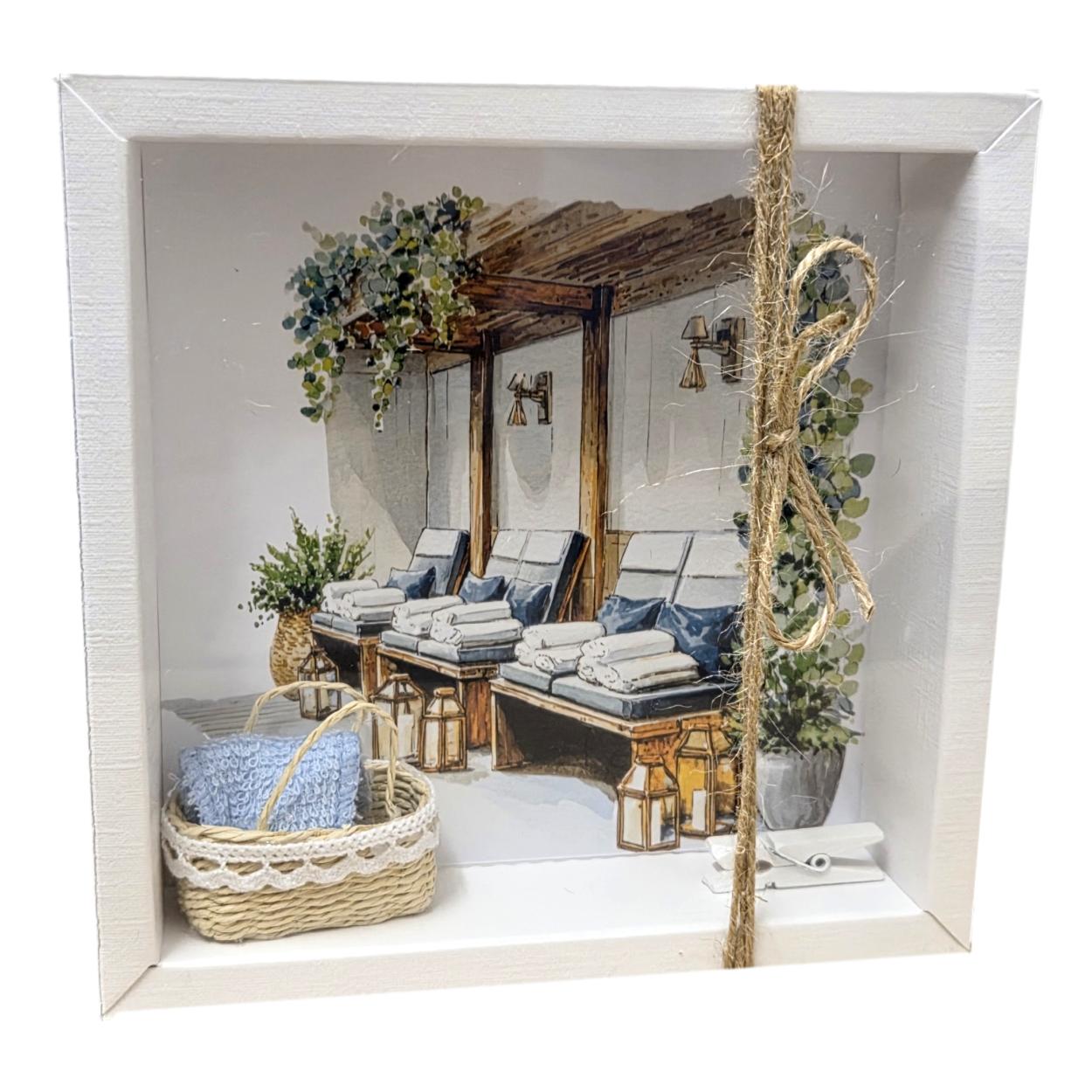 Lieferumfang:- Weiße Kartonnage mit transparentem Schiebedeckel, dekoriert mit Foto-Hintergrund Wellnessmotiv mit Liegen und Handtuchkorb