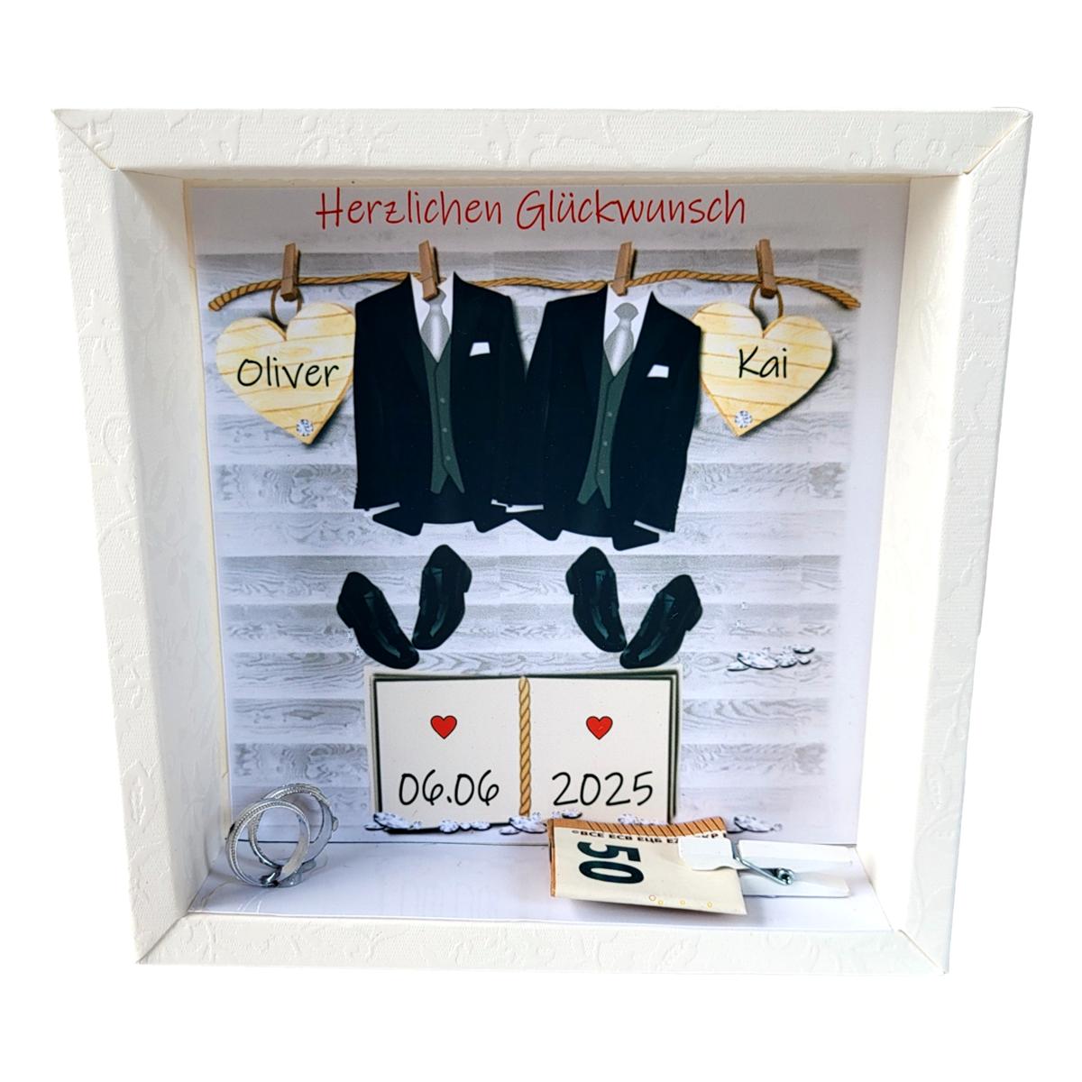 Der Rahmen zeigt zwei elegante Anzüge, Herzen mit den Namen des Paares und das Hochzeitsdatum. Mit viel Liebe gestaltet, bietet er zusätzlich Platz für Geldscheine, sodass dein Geschenk nicht nur schön, sondern auch praktisch ist.