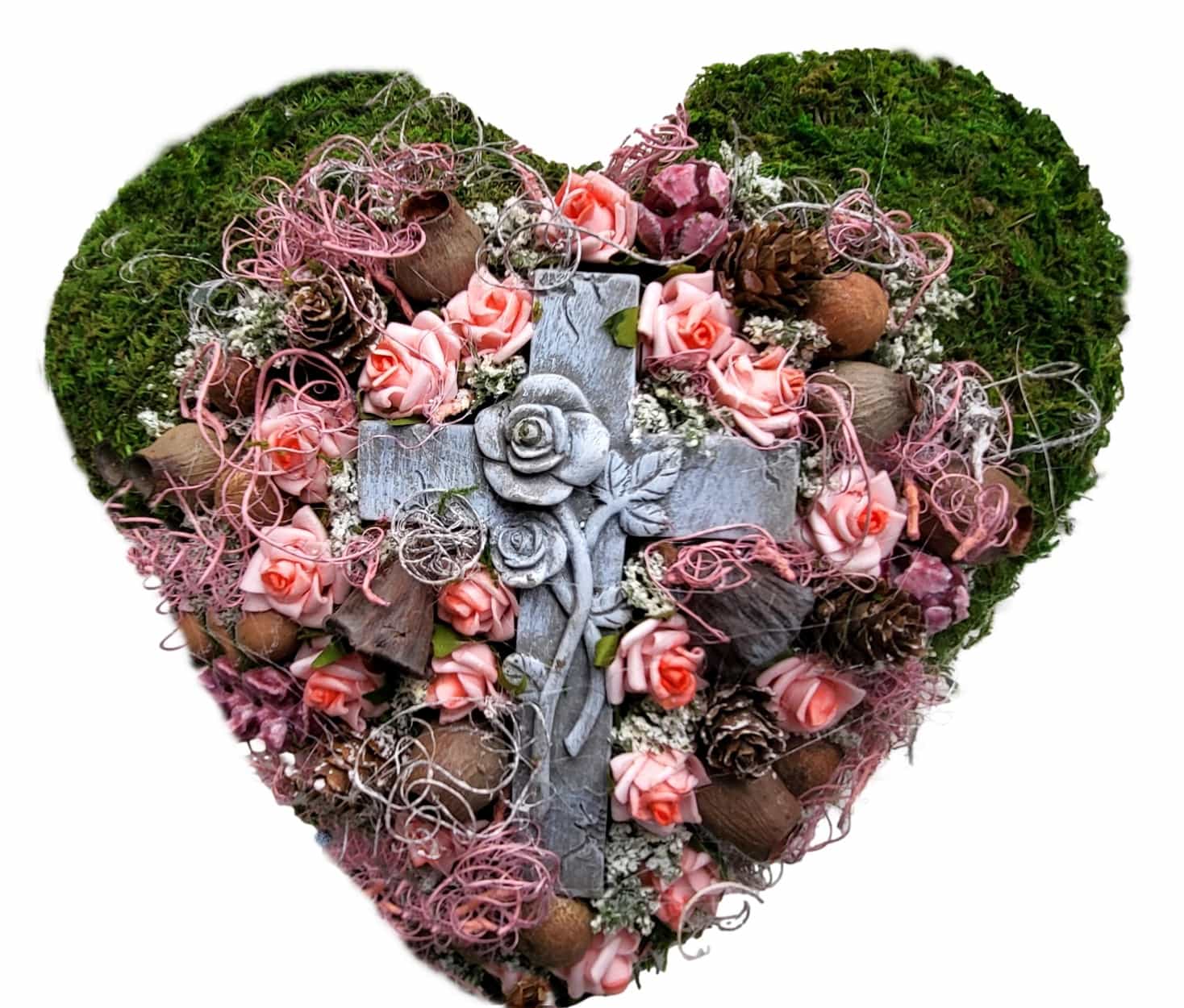 Grabgesteck Herz Moos rosa mit Kreuz kleine Rosen
