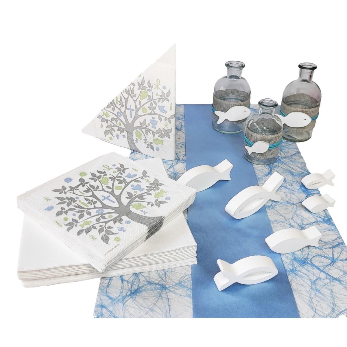 Tischdeoration zur Kommunion, Konfirmation oder Jugendweihe. Mit diesem tollen Tischset in Hellblau dekorieren Sie ganz einfach Ihre Festtafel.Tischdeko-Set für 20Personen, Deko für Jungen , mit Tischband, symbolischen Servietten, Kerzen, Streudeko und Vasen.Der Baum des Lebens auf den Servietten