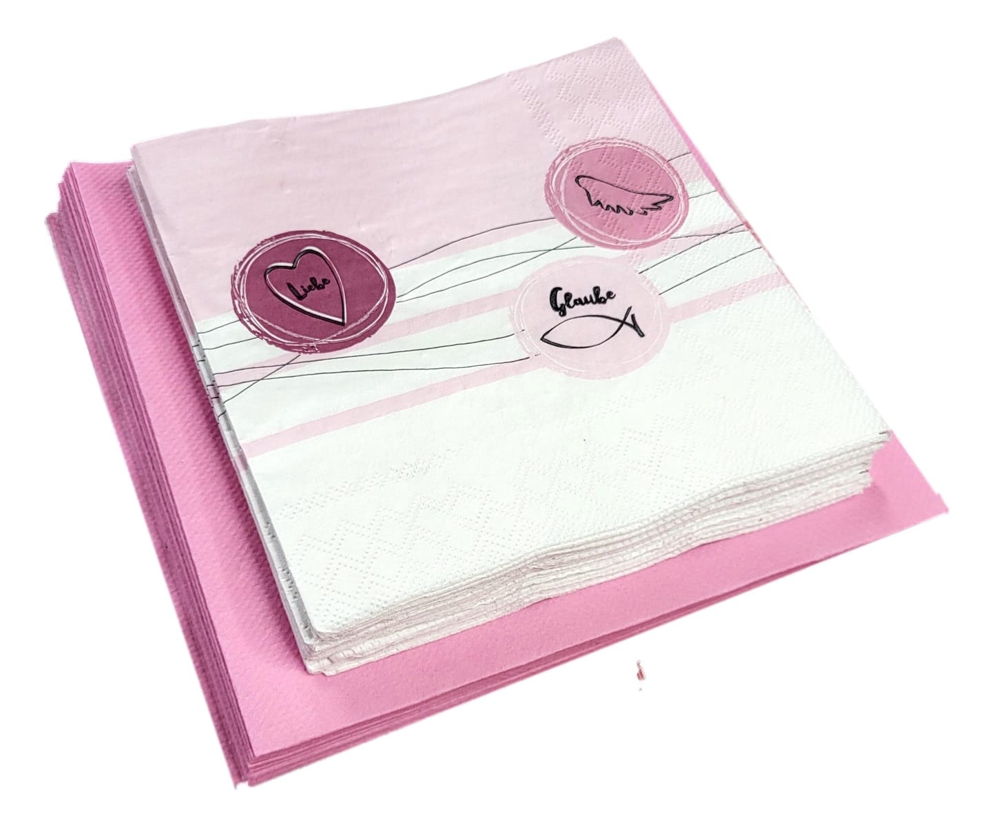 Die Servietten sind mit christlichen Symbolen wie einem Fisch und den Worten „Glaube“ und „Liebe“ verziert. Und passen perfekt zu einer Kommunion oder Konfirmation.