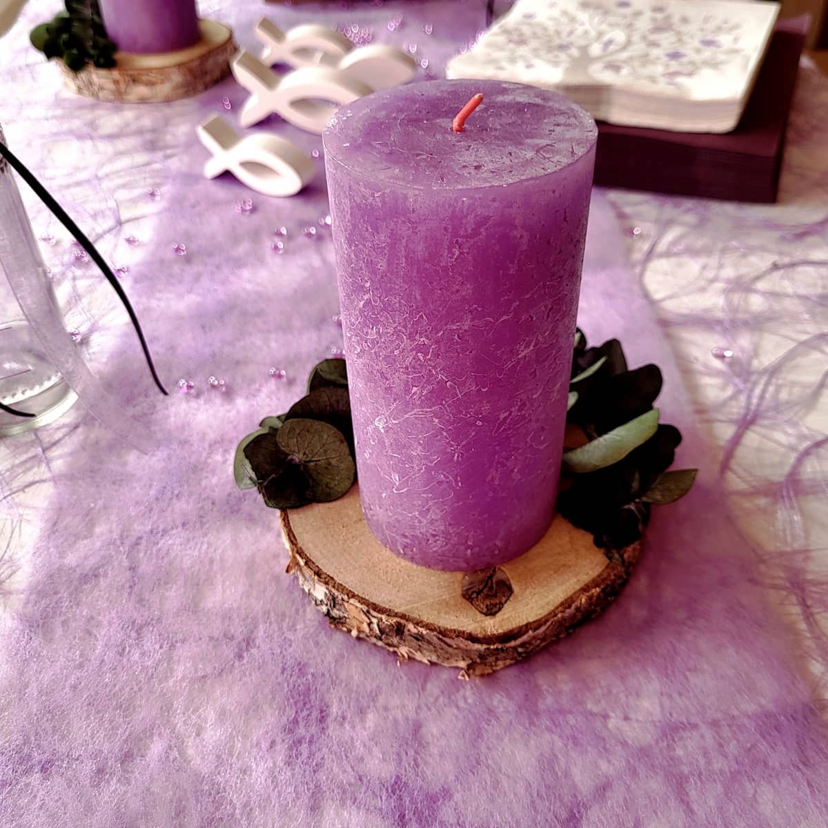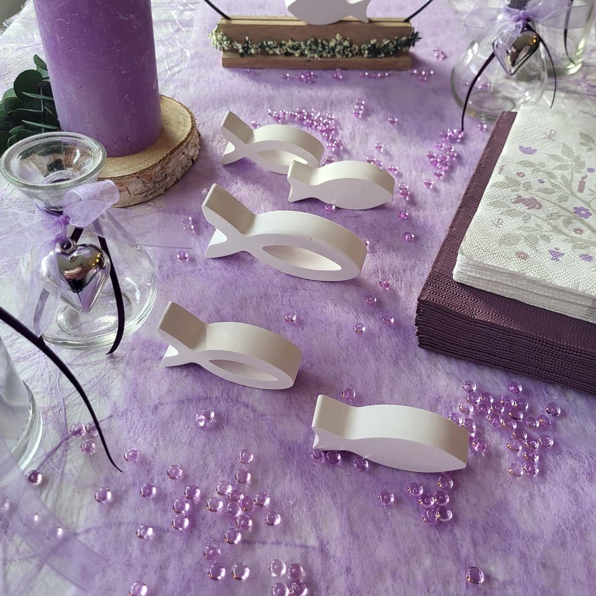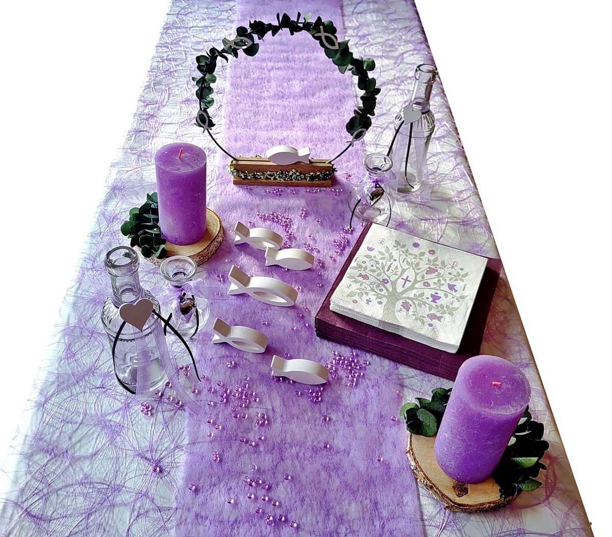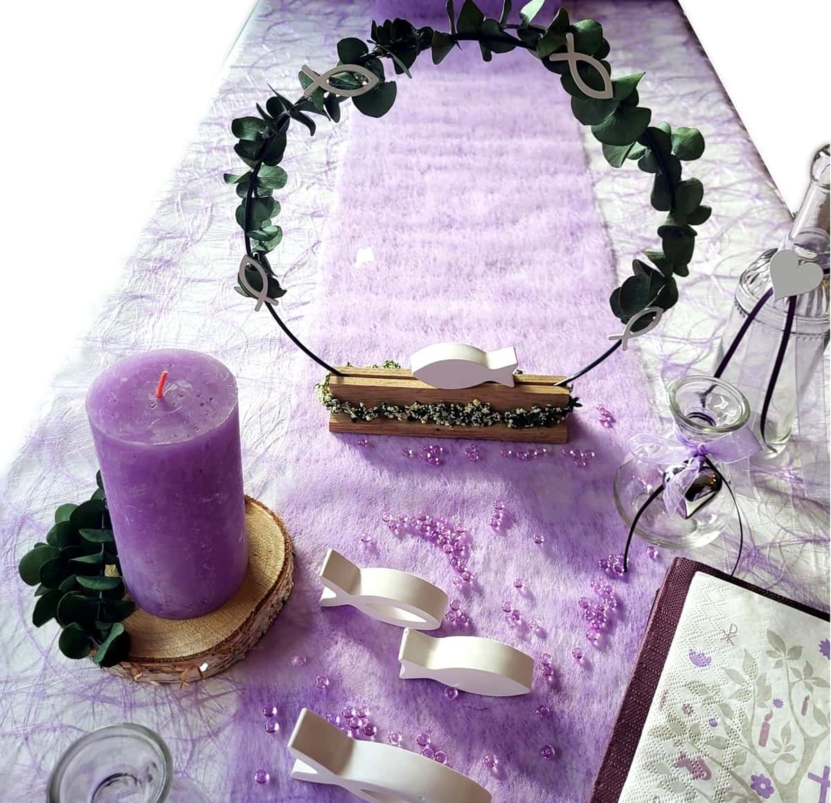 Tischdeko Deko Kommunion Konfirmation Set in Flieder und Lila , mit Kerzen, Vasen ,dekorierten Baumscheiben, Servietten, Streudeko, 6 gegossenen Fischen. Ein Eukalyptusring aus Metall auf einem Holzfuß dient als Tischaufsteller dazu Sizoweb Tischband für eine gelungene Tischekoration .