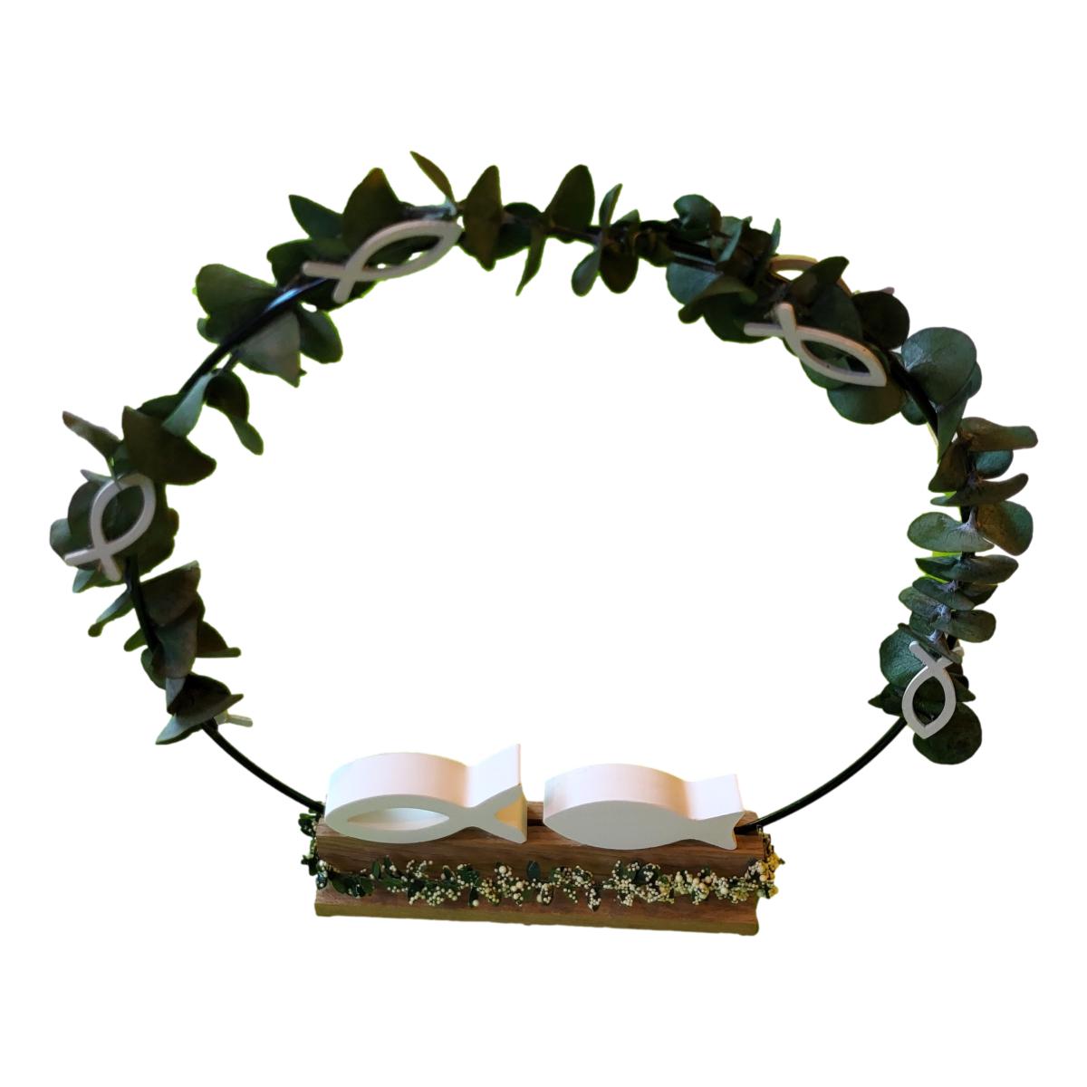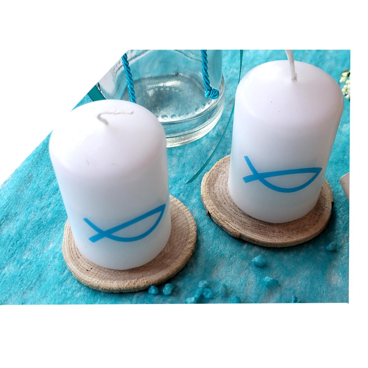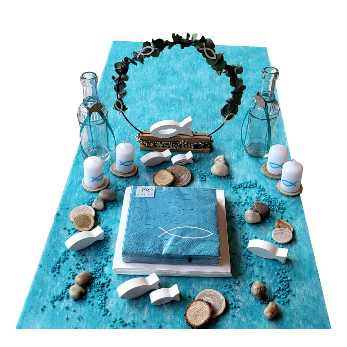 Tischdeko Deko Kommunion Konfirmation Set in türkis , mit Kerzen, Vasen , Baumscheiben, Servietten, Streudeko, 6 gegossenen Fischen. Ein Eukalyptusring aus Metall auf einem Holzfuß dient als Tischaufsteller dazu ein türkises Tischband für eine gelungene Tischekoration .